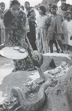 a deadly cobra, a woman of Madras tenders it rice and coconut. When