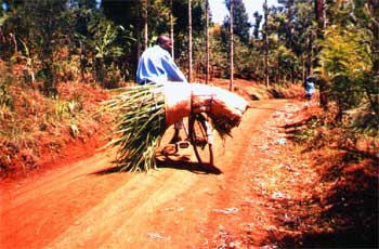 Well, on this Saturday I was making lots of job security for the laundry help. As the road rose up the hill it got steeper, and low gear was now working. I was totally winded, and because of the slippery road I was not getting very far. So, I got off and pushed. You can cover a lot of miles in Africa if you don't mind pushing part of the way. Then, there was level ground for a while, hop on, and peddle. Off again for another push. This went on and on.